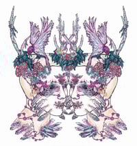 A delicate yet powerful exploration of duality, transformation, and resilience. *Bruises* depicts two mirrored figures adorned with organic and crystalline elements, their faces marked by floral textures and ethereal embellishments. Rich in symbolism, the piece captures the beauty of healing and survival.